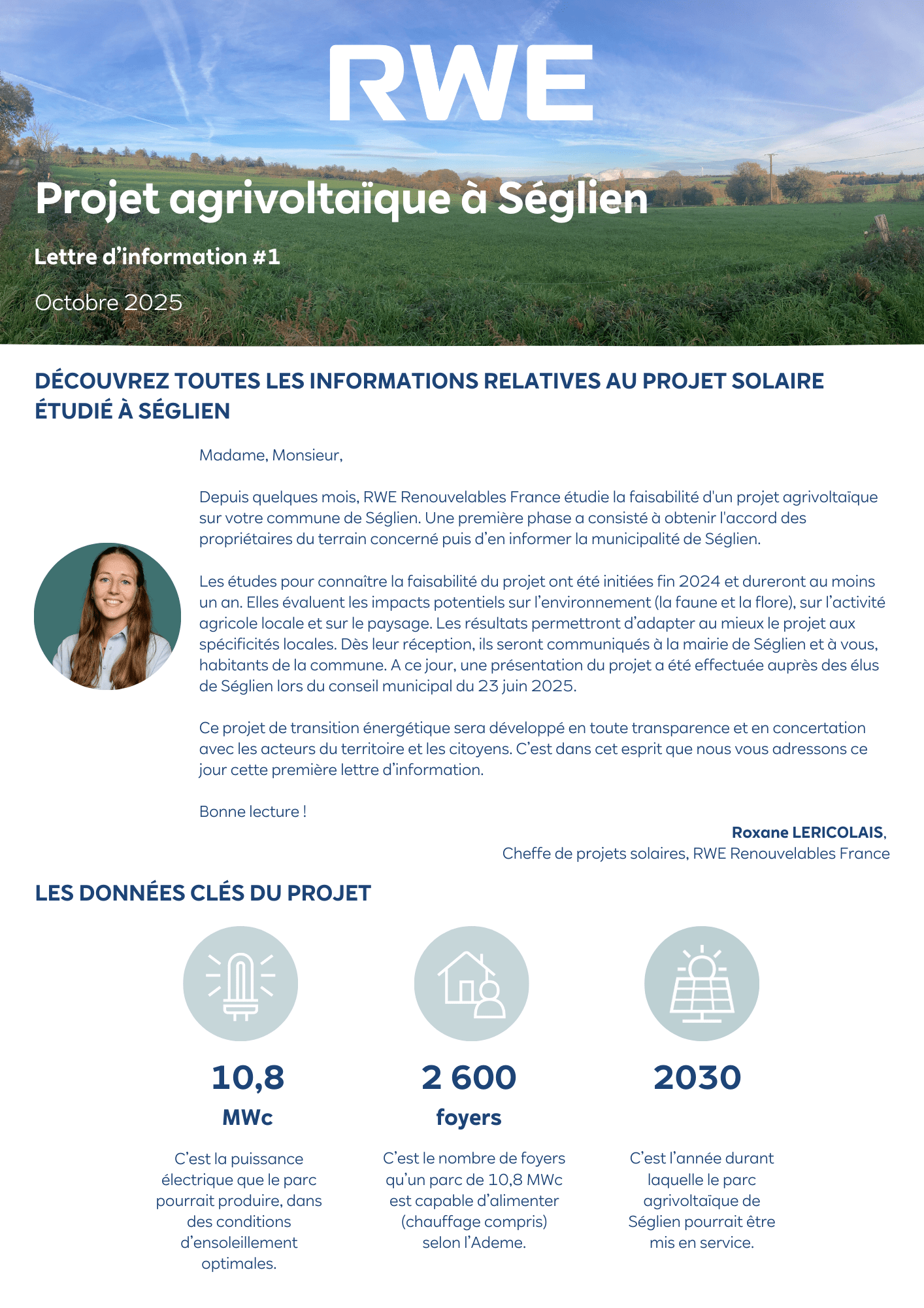 Tout au long du développement du projet, des lettres d’information sont distribuées aux habitants, afin d’exposer l’actualité du projet agrivoltaïque : enjeux et avancées des études, calendrier, etc.